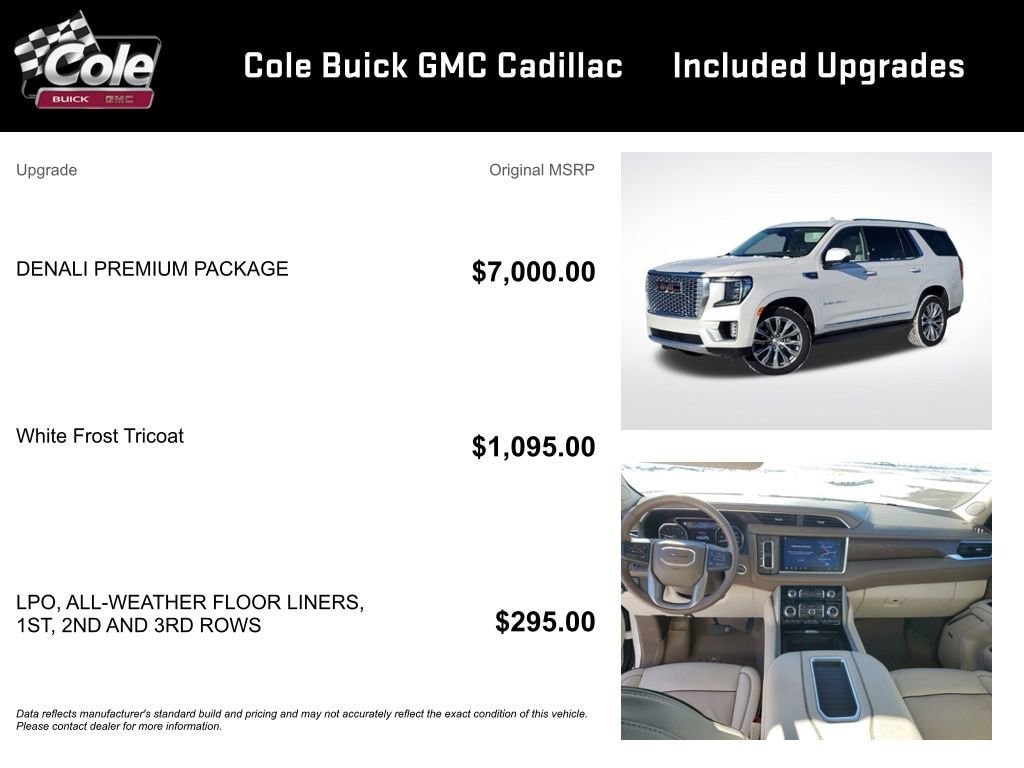 GMC Certified Pre-Owned Certified, 4WD, 12-Way Power Seat Adjusters, 14 Speakers, 15 Diagonal Multi-Color Head-Up Display, 1st, 2nd & 3rd Row All-Weather Floor Liner (LPO), 2 Presets For Outside Rearview Mirrors, 3.23 Rear Axle Ratio, 3rd Row 60/40 Power-Folding Split-Bench Seat, 3rd row seats: split-bench, 4-Wheel Disc Brakes, ABS brakes, Adaptive Cruise Control, Adaptive suspension, Advanced Security Package, Advanced Technology Package, Air Conditioning, Alloy wheels, AM/FM radio: SiriusXM with 360L, Apple CarPlay/Android Auto, Auto High-beam Headlights, Auto-dimming door mirrors, Auto-dimming Rear-View mirror, Auto-leveling suspension, Automatic Emergency Braking, Automatic temperature control, Bodyside moldings, Bose 14-Speaker Surround w/CenterPoint, Brake assist, Bright Front & Rear Door Sill Plates, Bumpers: body-color, Chrome Door Handles w/Body-Color Strip, Compass, Delay-off headlights, Denali Premium Package, Driver door bin, Driver vanity mirror, Dual Exhaust System, Dual front impact airbags, Dual front side impact airbags, Dual-Pane Panoramic Power Sunroof, Electronic Stability Control, Emergency communication system: OnStar and GMC connected services capable, Enhanced Automatic Emergency Braking, Following Distance Indicator, Forward Collision Alert, Four wheel independent suspension, Front & Rear Park Assist, Front anti-roll bar, Front Bucket Seats, Front Center Armrest, Front dual zone A/C, Front fog lights, Front Pedestrian Braking, Front reading lights, Fully automatic headlights, Galvano Bodyside Moldings, Garage door transmitter, Glass Breakage Sensor, Hands-Free Power Programmable Rear Liftgate, HD Radio, HD Surround Vision, Heads-Up Display, Heated & Ventilated Driver & Front Passenger Seats, Heated 2nd Row Outboard Position Seats, Heated Automatic Steering Wheel, Heated door mirrors, Heated Driver & Front Passenger Seats, Heated front seats, Heated rear seats, Heated steering wheel, Hill Descent Control, Illuminated entry, Inside Rear-View Auto-Dimming Mirror, Inside Rearview Auto-Dimming Rear Camera Mirror, IntelliBeam Automatic High Beam On/Off, Lane Change Alert w/Side Blind Zone Alert, Lane Keep Assist w/Lane Departure Warning, Leather steering wheel, Low tire pressure warning, Magnetic Ride Control Suspension, Memory seat, Navigation System, Occupant sensing airbag, Outside Heated Power-Adjustable Mirrors, Outside temperature display, Overhead airbag, Overhead console, Panic alarm, Passenger door bin, Passenger vanity mirror, Perforated Leather Seating Surfaces, Power door mirrors, Power driver seat, Power Liftgate, Power passenger seat, Power Release 2nd Row Bucket Seats, Power steering, Power Tilt & Telescopic Steering Column, Power windows, Power-Retractable Assist Steps, Preferred Equipment Group 5SA, Radio: AM/FM/SiriusXM w/Navigation, Rain sensing wipers, Rear air conditioning, Rear anti-roll bar, Rear Camera Mirror Washer, Rear Cross Traffic Alert, Rear Pedestrian