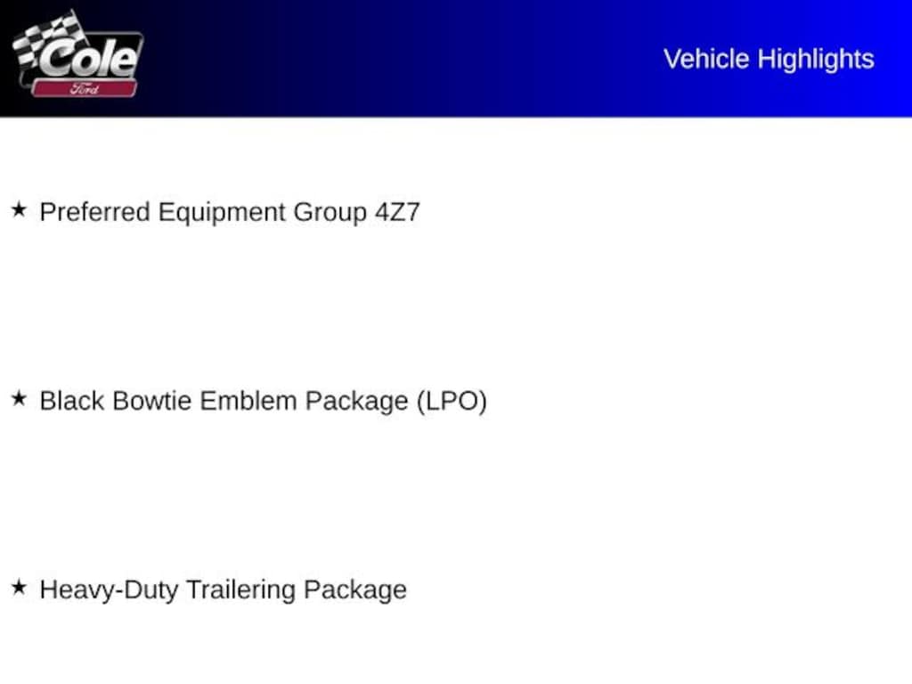 4WD, Black Bowtie Emblem Package (LPO), Heavy-Duty Trailering Package, Preferred Equipment Group 4Z7, 3.42 Rear Axle Ratio, 4-Way Power Front Passenger Seat Adjuster, 4-Wheel Disc Brakes, 6 Speakers, 6-Speaker Audio System Feature, ABS brakes, Air Conditioning, Alloy wheels, AM/FM radio: SiriusXM, Apple CarPlay, Auto-dimming Rear-View mirror, Automatic temperature control, Black Spray-On Bedliner w/Chevrolet Logo, Bose Premium 7-Speaker Audio System Feature, Bumpers: body-color, Cloth/Leatherette Seat Trim, Compass, Delay-off headlights, Driver 4-Way Power Seat Adjuster, Driver door bin, Driver vanity mirror, Dual front impact airbags, Dual front side impact airbags, Electronic Stability Control, Emergency communication system: OnStar Guidance, Exterior Parking Camera Rear, Front anti-roll bar, Front Bucket Seats, Front Center Armrest, Front fog lights, Front License Plate Kit, Front reading lights, Front wheel independent suspension, Fully automatic headlights, Heated Driver & Front Passenger Seats, Heated front seats, Illuminated entry, Low tire pressure warning, Occupant sensing airbag, Outside temperature display, Overhead airbag, Overhead console, Panic alarm, Passenger door bin, Passenger vanity mirror, Power door mirrors, Power Driver Lumbar Control Seat Adjuster, Power driver seat, Power Passenger Lumbar Control Seat Adjuster, Power passenger seat, Power steering, Power windows, Premium audio system: Chevrolet MyLink, Radio data system, Radio: AM/FM/SiriusXM w/Chevrolet MyLink, Radio: AM/FM/SiriusXM w/Chevrolet MyLink & Nav, Rear reading lights, Rear seat center armrest, Rear step bumper, Rear window defroster, Remote keyless entry, Security system, SiriusXM Satellite Radio, Speed control, Speed-sensing steering, Steering wheel mounted audio controls, Tachometer, Telescoping steering wheel, Tilt steering wheel, Traction control, Trip computer, Variably intermittent wipers, Wheels: 17" x 8" Dark Argent Metallic Cast Alloy, 4WD, Black Bowtie Emblem Package (LPO), Heavy-Duty Trailering Package, Preferred Equipment Group 4Z7.