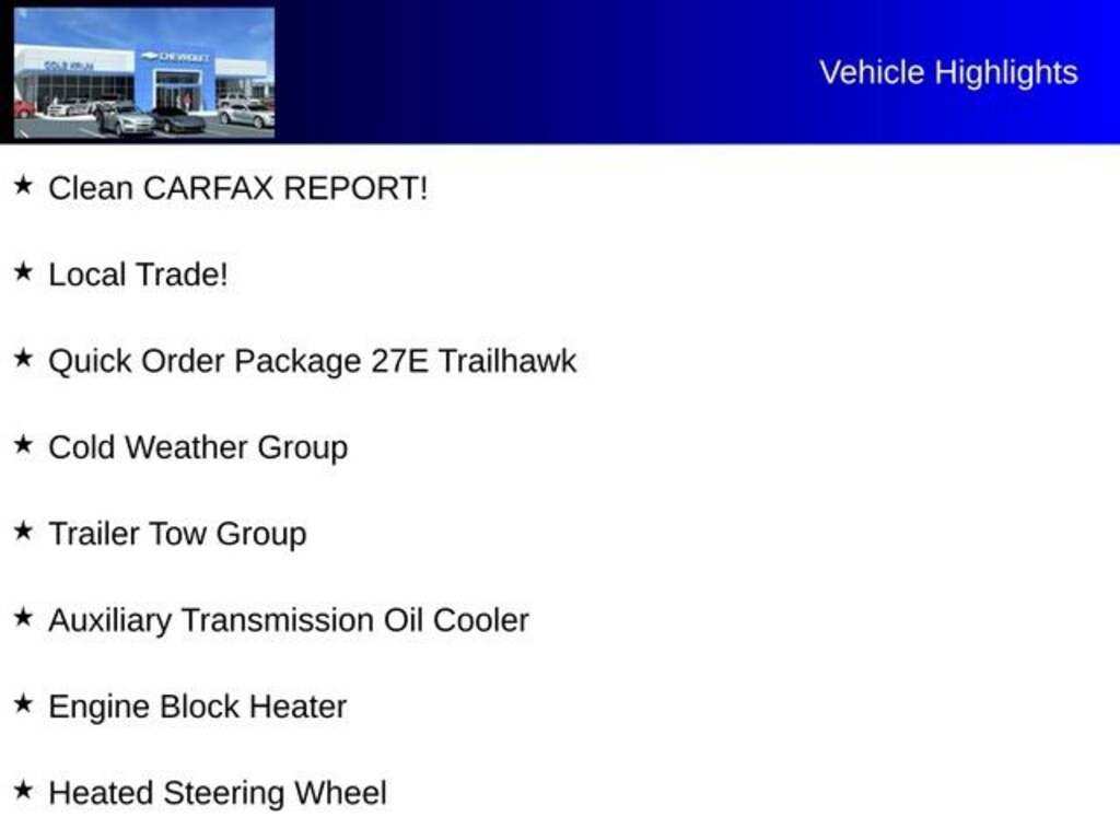Powered by a robust 3.2L V6 engine and a smooth-shifting 9-speed automatic transmission, this Trailhawk model delivers an impressive 18 city/24 highway MPG. Equipped with the Cold Weather Group and Trailer Tow Group, this Jeep is ready to tackle the elements and handle all your towing needs.